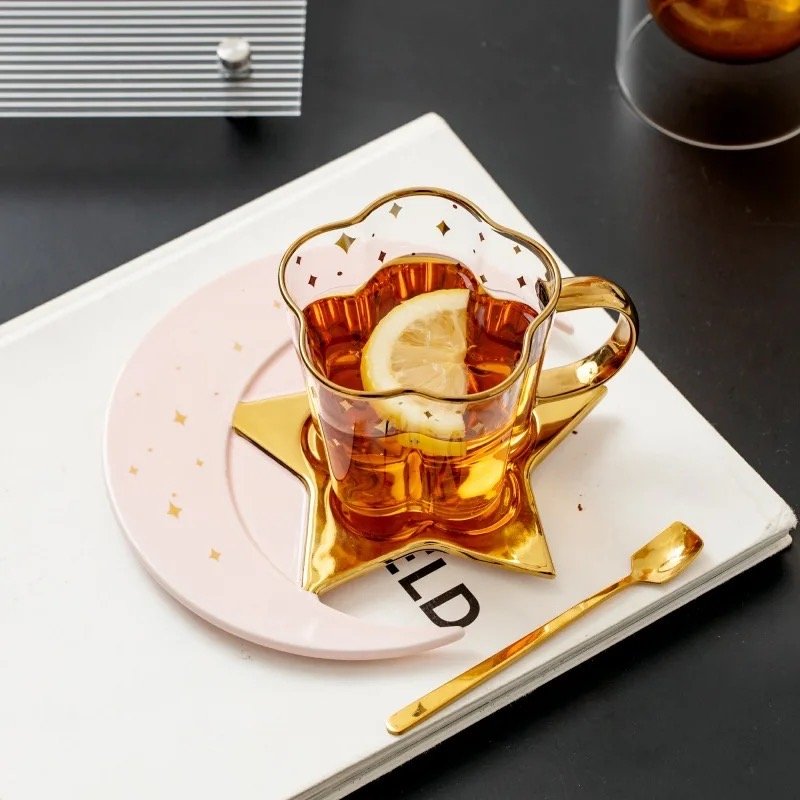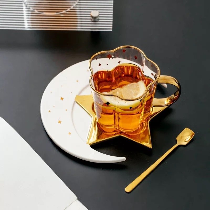 Glass Cups & Moon Shaped Saucers star Detailing.