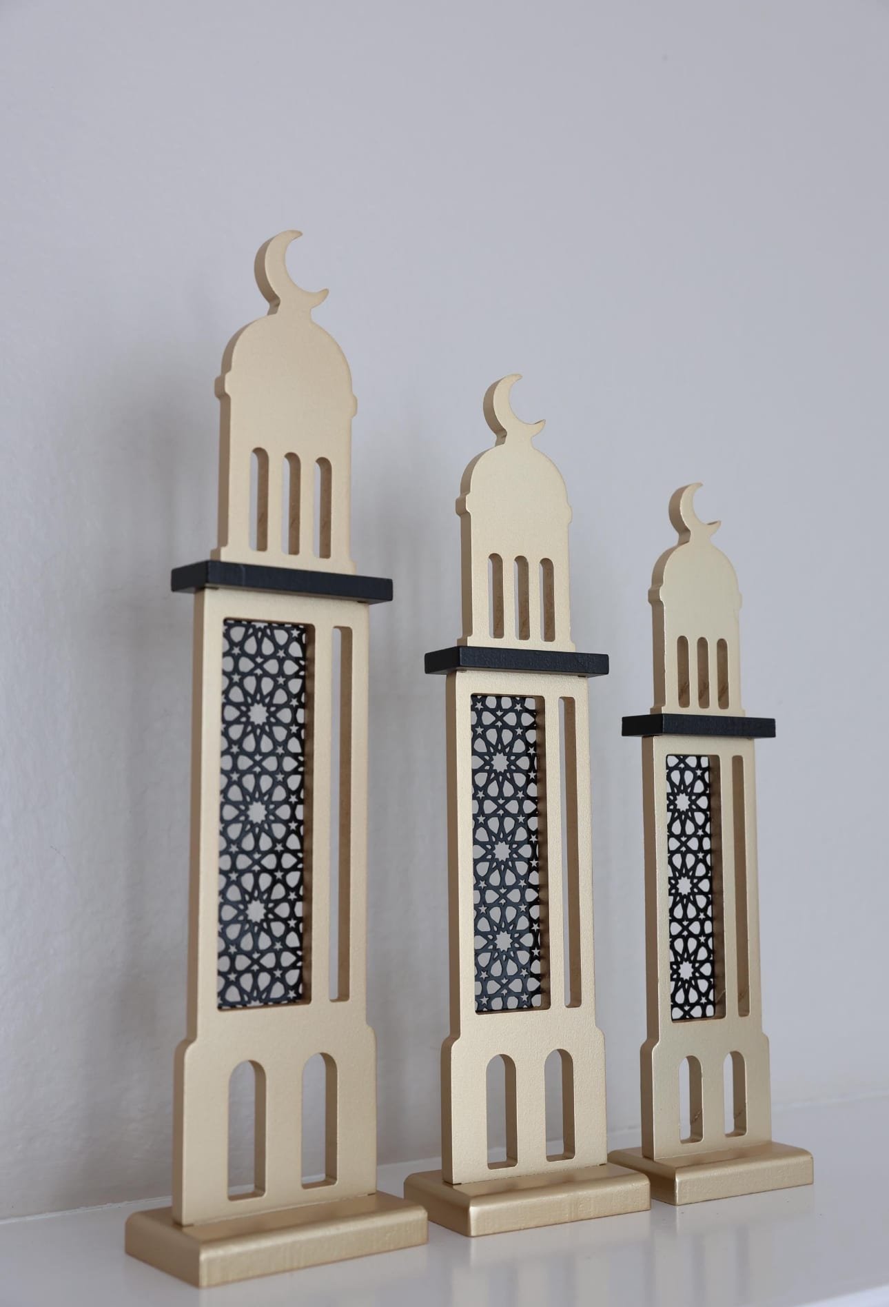 The slim minaret silhouette is complemented by a detailed geometric patterned panel that adds depth and visual interest, while the sturdy base allows it to stand beautifully on tables, shelves, consoles, and prayer corners. Perfect as a single statement piece or styled as a set of three for a layered look.