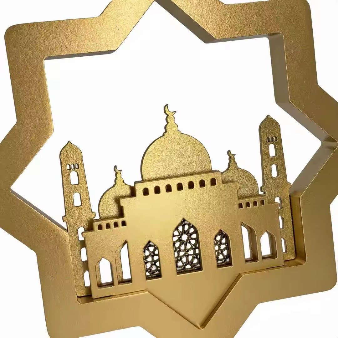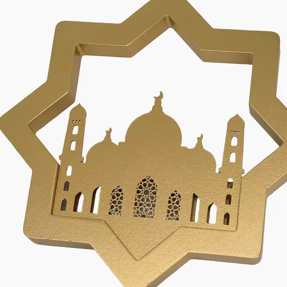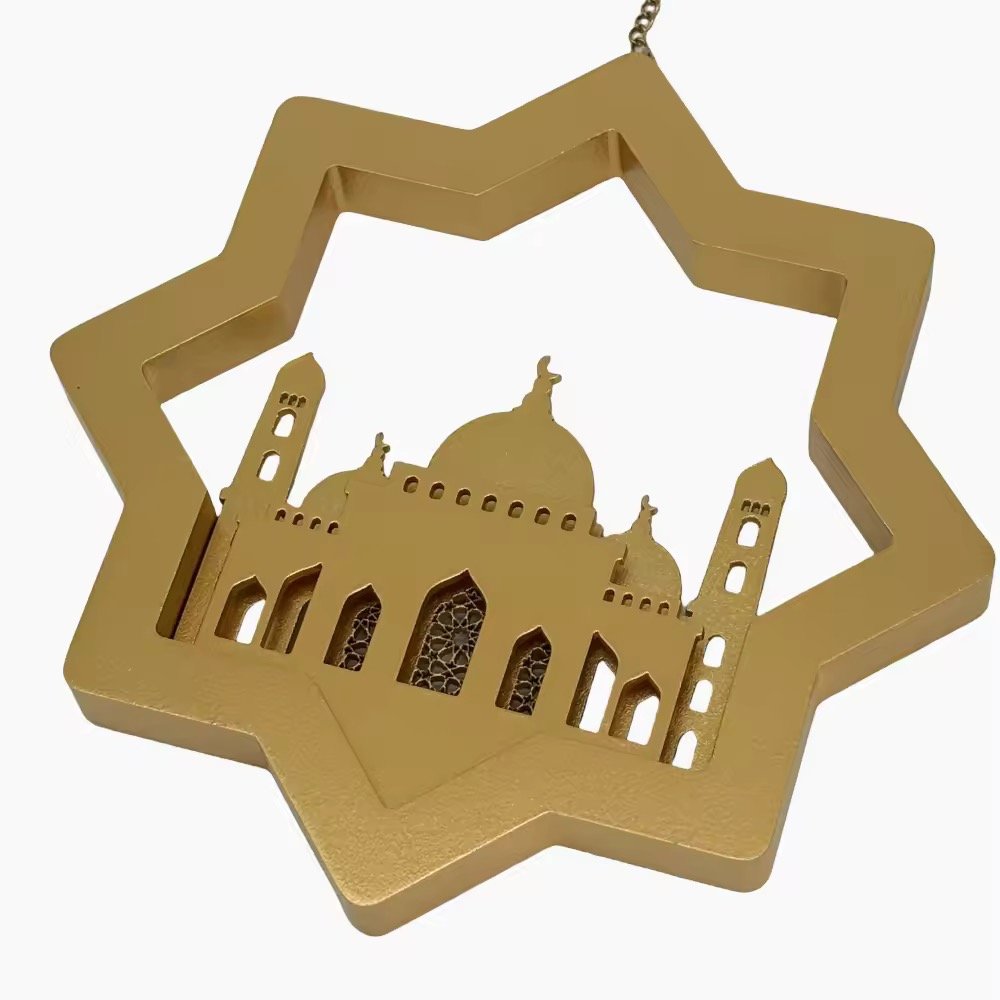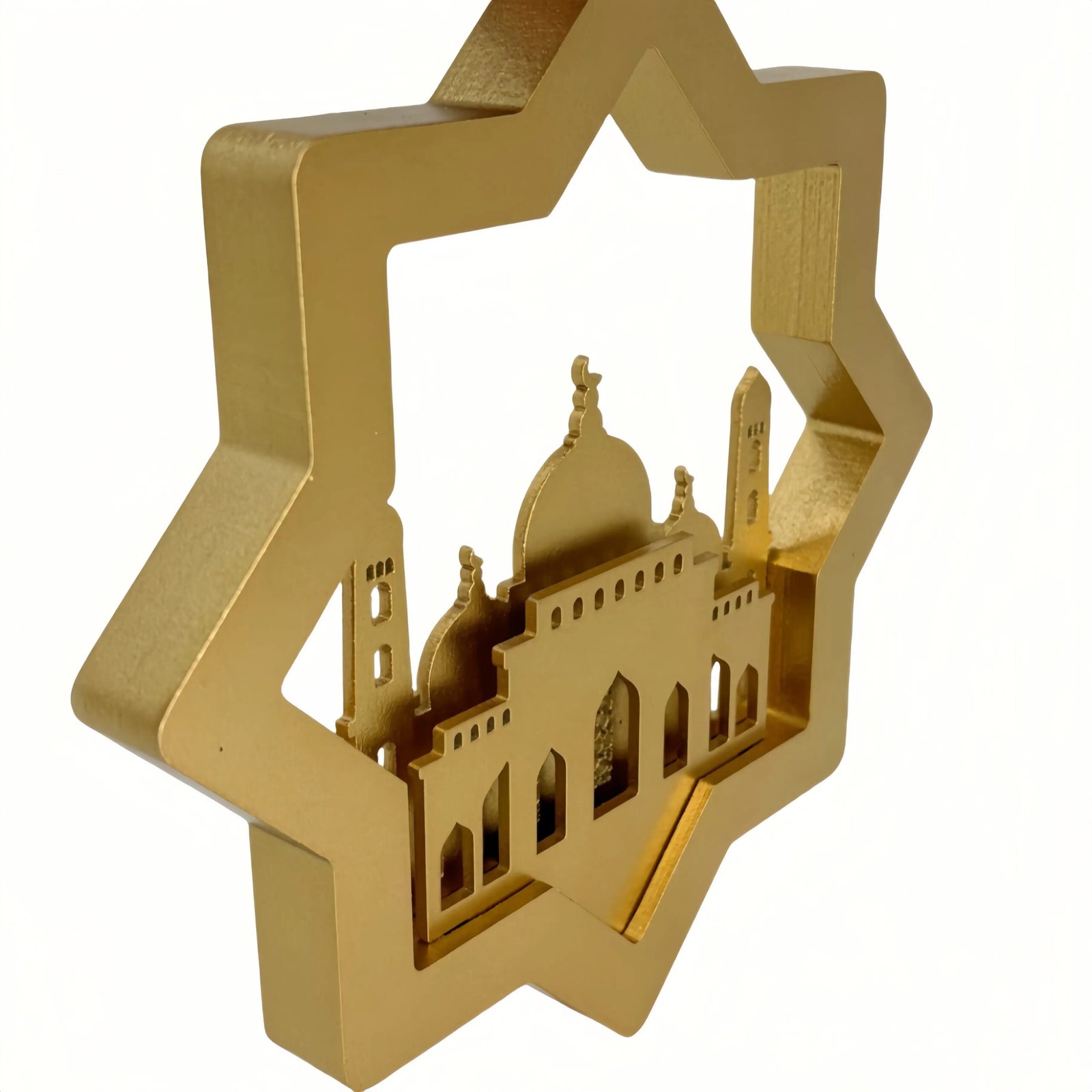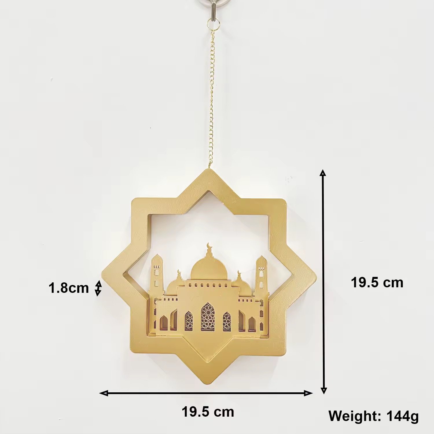 Elevate your space with the timeless beauty of this Golden Star Mosque Hanging Décor. Designed in a striking star-shaped frame, this piece features a delicately detailed mosque silhouette at its center, symbolizing peace, faith, and spiritual harmony.