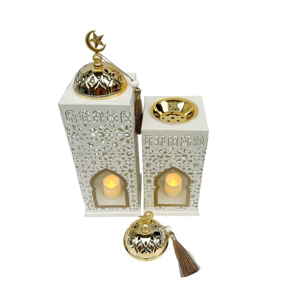 A modern LED burner lantern designed to bring a soft, glowing ambiance to your Ramadan décor. Its sleek metal structure makes it ideal for tabletops, shelves, or floor styling.