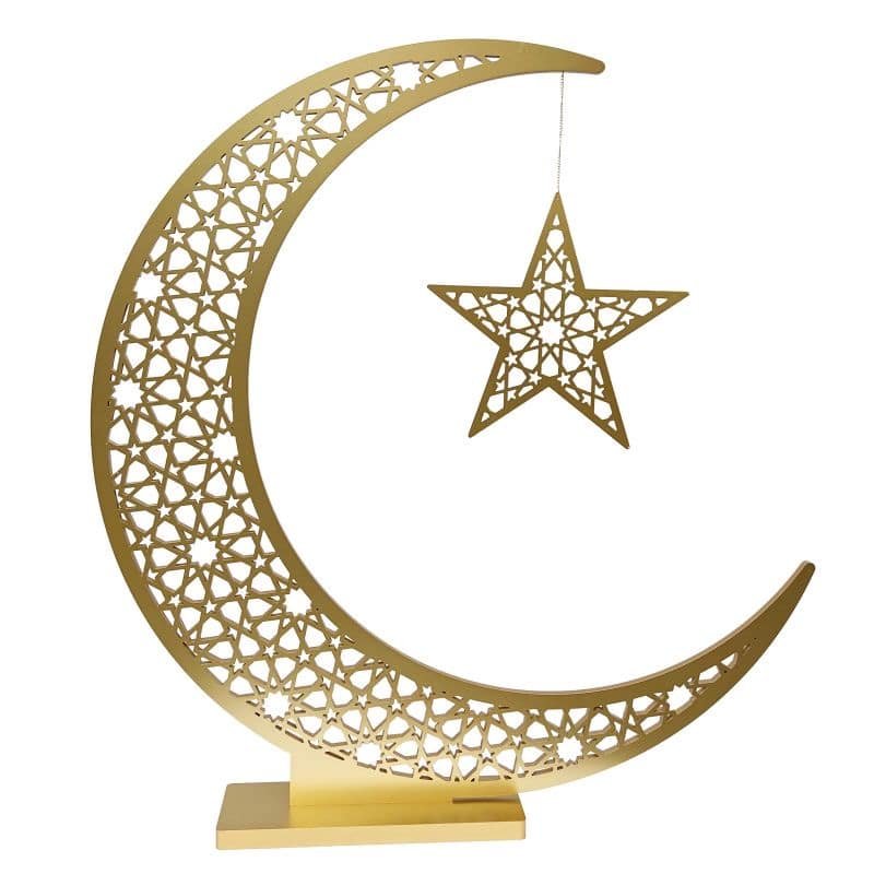 A beautifully crafted wooden crescent moon stand finished in gold. Perfect as a statement décor piece for Ramadan displays, events, or store setups.