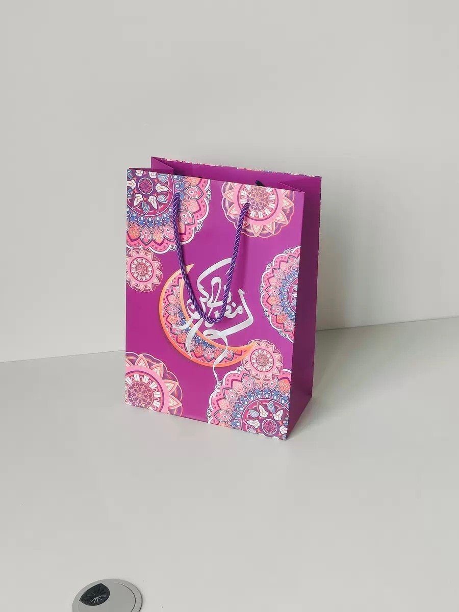 Made from sturdy paper with reinforced sides and matching rope handles, it is ideal for carrying gifts, sweets, clothing, prayer items, and Eid hampers. The rich purple tone combined with detailed patterns makes it perfect for both adults and children, adding a premium touch to your gift presentation.