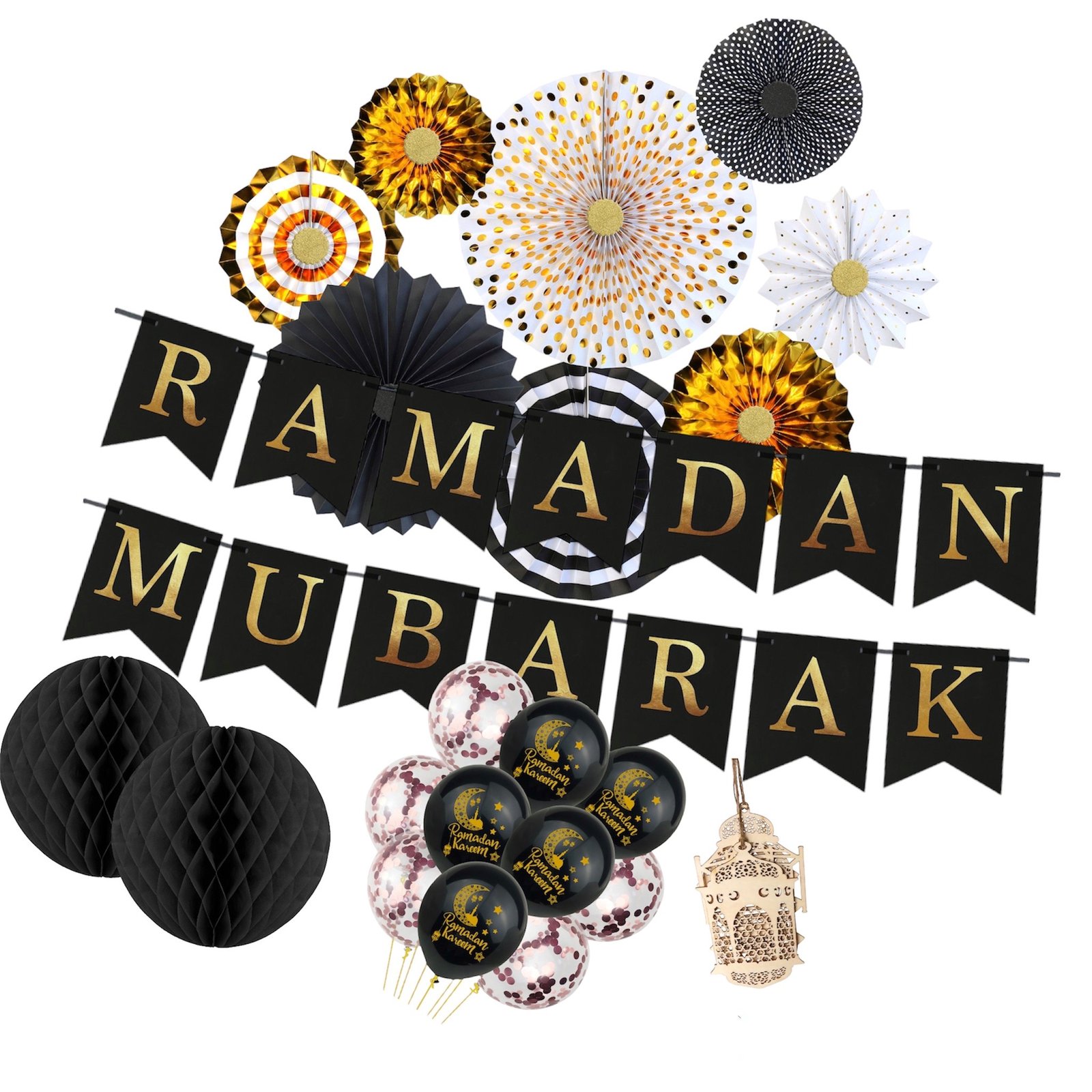 Home Ramadan set Ramadan Mubarak Dovetail Bunting & black paper fan Balloon Set R101