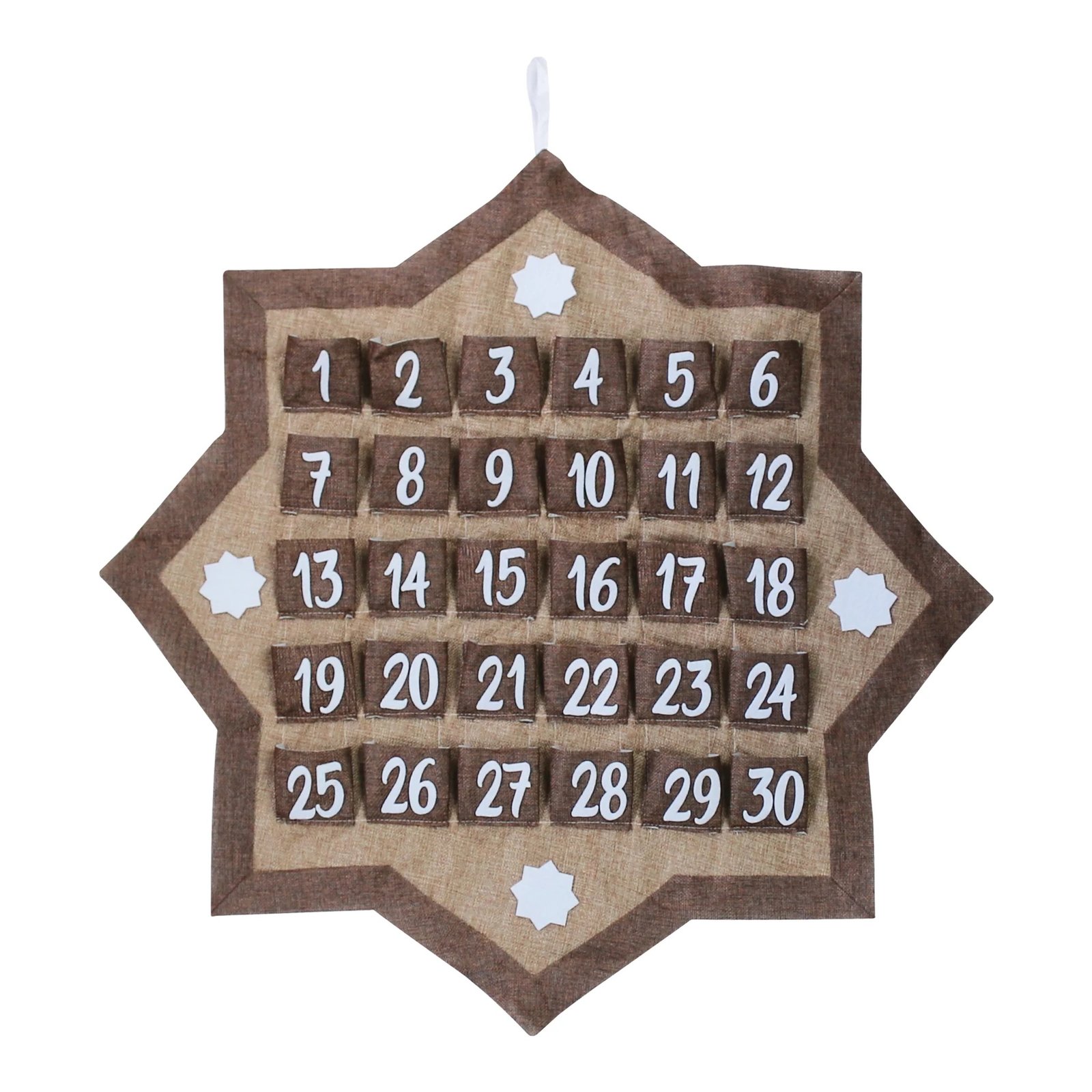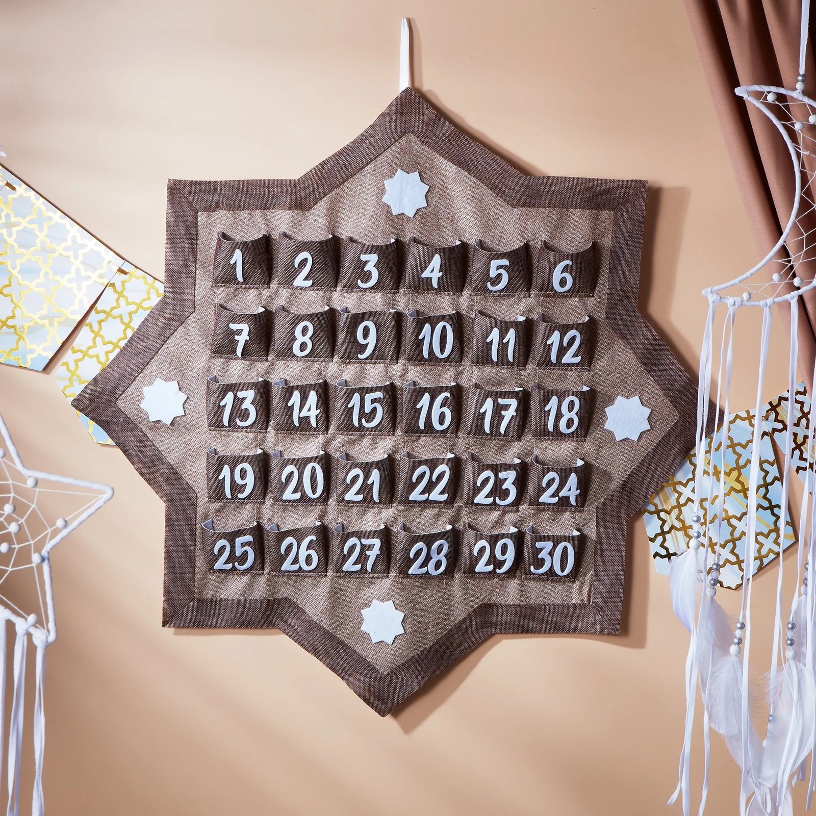 • A shabby chic rustic-look hessian Ramadan advent calendar in an 8-point star shape