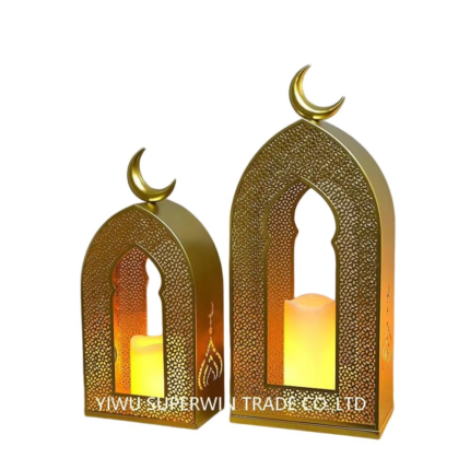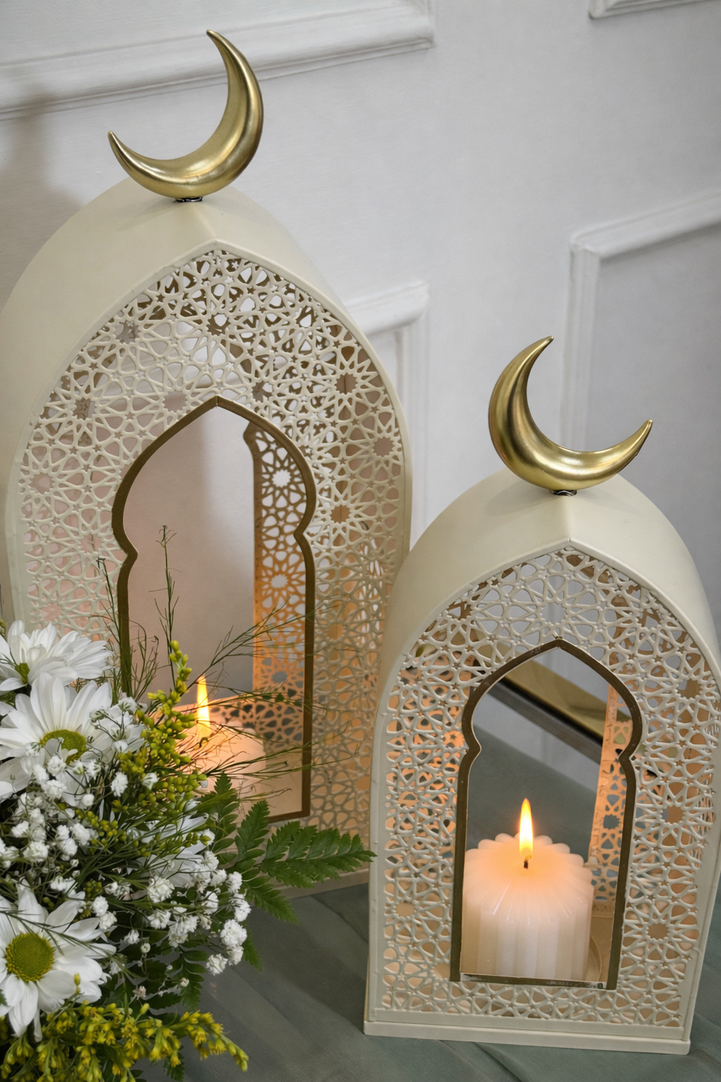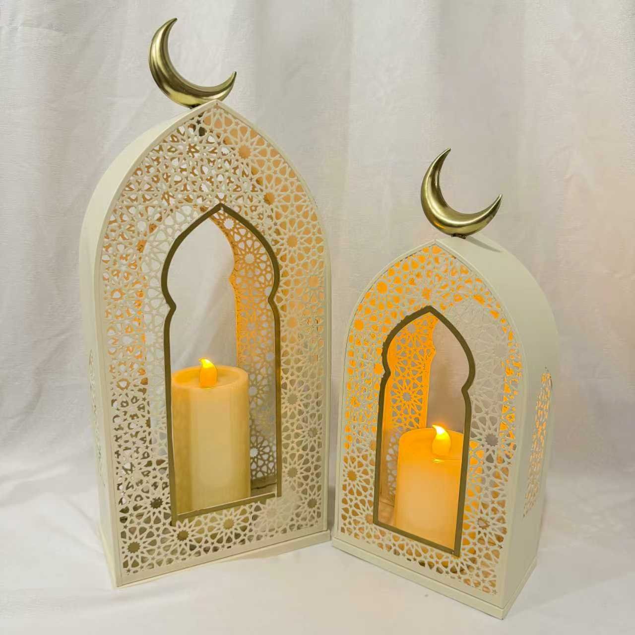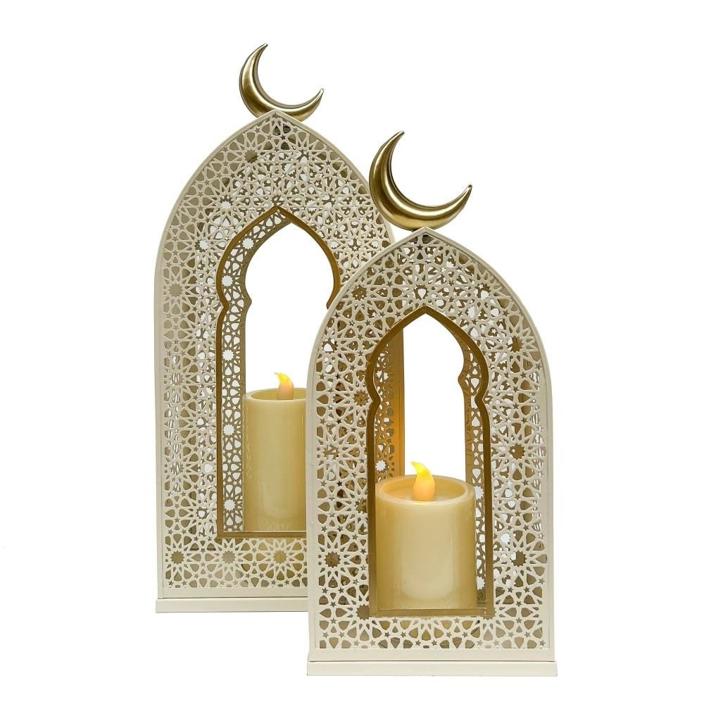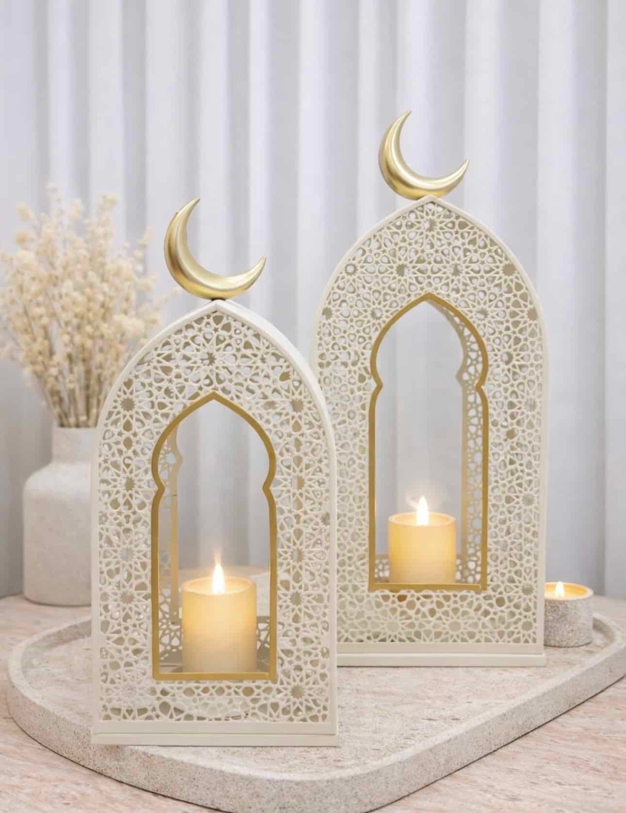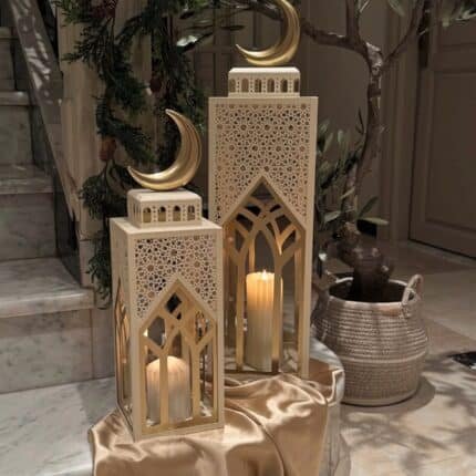 A beautifully crafted metal lantern set designed to elevate your Ramadan and Eid décor. This set includes two lanterns in complementary sizes, each fitted with a candle for a warm, ambient glow. Perfect for tabletops, entrances, or prayer corners.